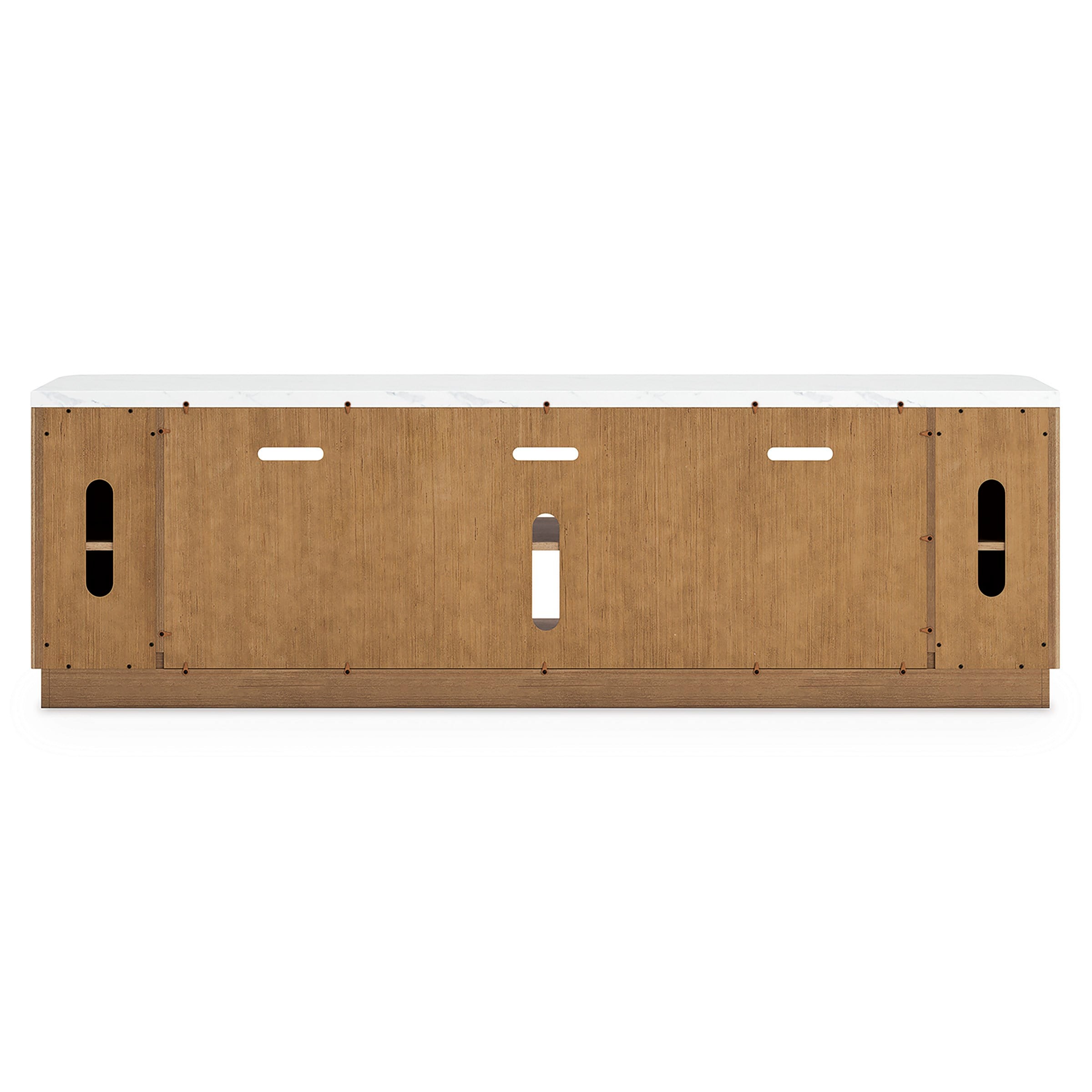 Zarafet ile doğal dokunuşları bir araya getiren bu TV ünitesi, çağdaş yaşam alanlarına modern bir karakter kazandırır. Mermer görünümlü üst tablası ile çizgisel yüzey detaylarına sahip gövdesi, güncel tasarım anlayışını güçlü bir şekilde yansıtır. Açık raf sistemi ve kapaklı dolapları sayesinde medya ekipmanlarınızı düzenli bir şekilde sergileyebilir ve saklayabilirsiniz.