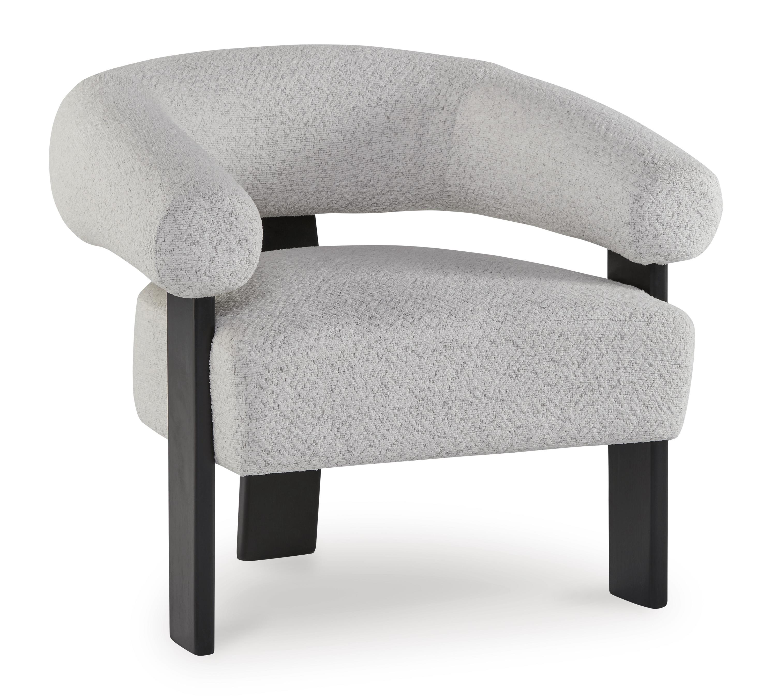 • Polyester kumaş döşeme • Barrel back (yuvarlak sırt) ve cut-out detaylı tasarım • Sabit oturum minderi • 3 ayaklı ahşap gövde • Mat siyah ayak kaplama • Modern ve heykelsi tasarım dili • Konforlu ve estetik oturum deneyimi • Farklı dekorasyonlarla uyumlu yapı • Dayanıklı ve sağlam kullanım.