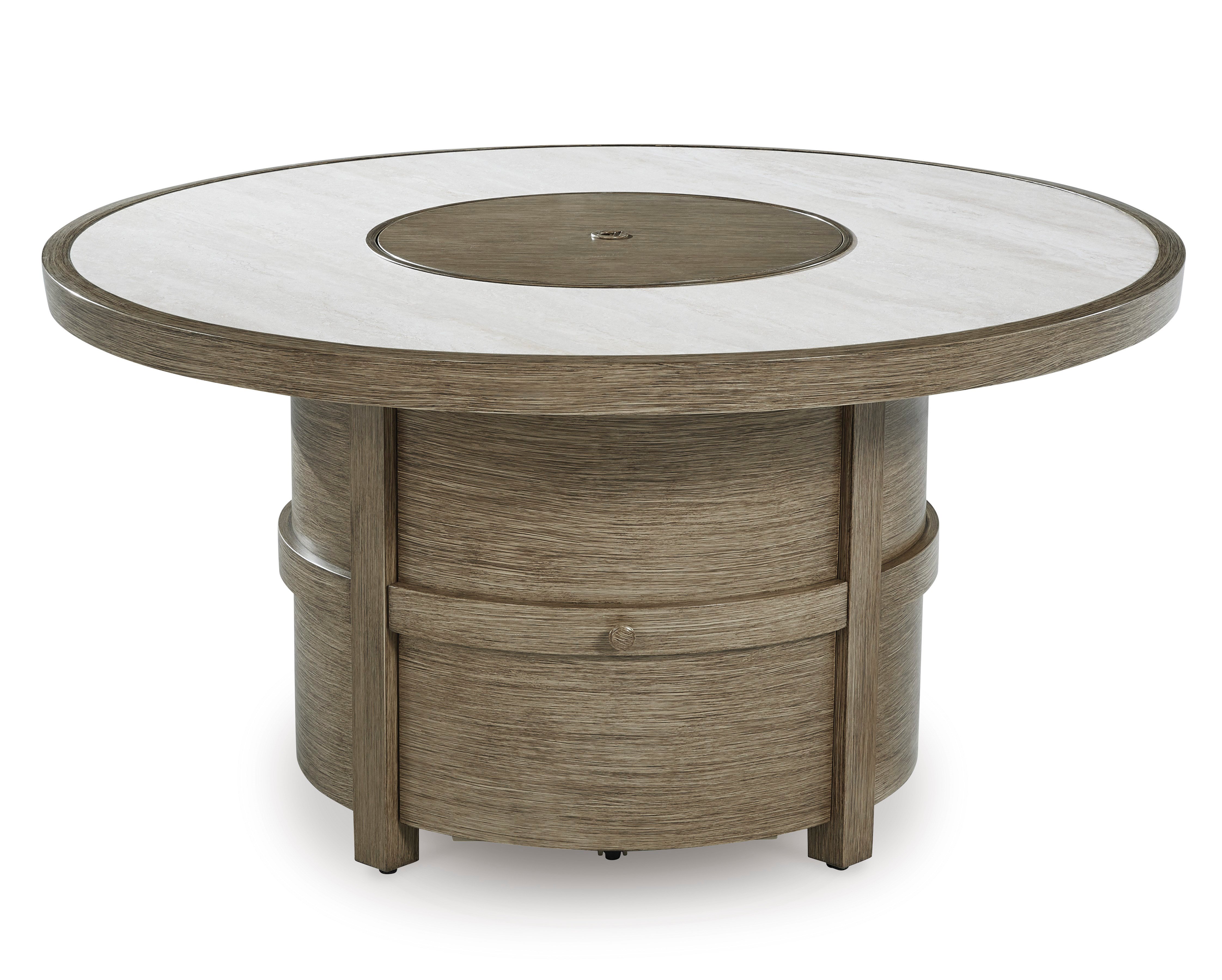 Dış mekân yaşam alanınıza şıklık ve işlevsellik katan bu açık hava şömine masası, alüminyum iskeleti ve ahşap görünümlü kaplaması ile modern bir estetik sunar. Sinterlenmiş taş üst tabla, doğal taş görünümü ile mekâna zarif bir dokunuş katarken; paslanmaz çelik brülör ve cam boncuklar etkileyici bir atmosfer yaratır. Bahçe veya terasınızda hem ısınma hem de görsel odak noktası olarak kullanılabilir.