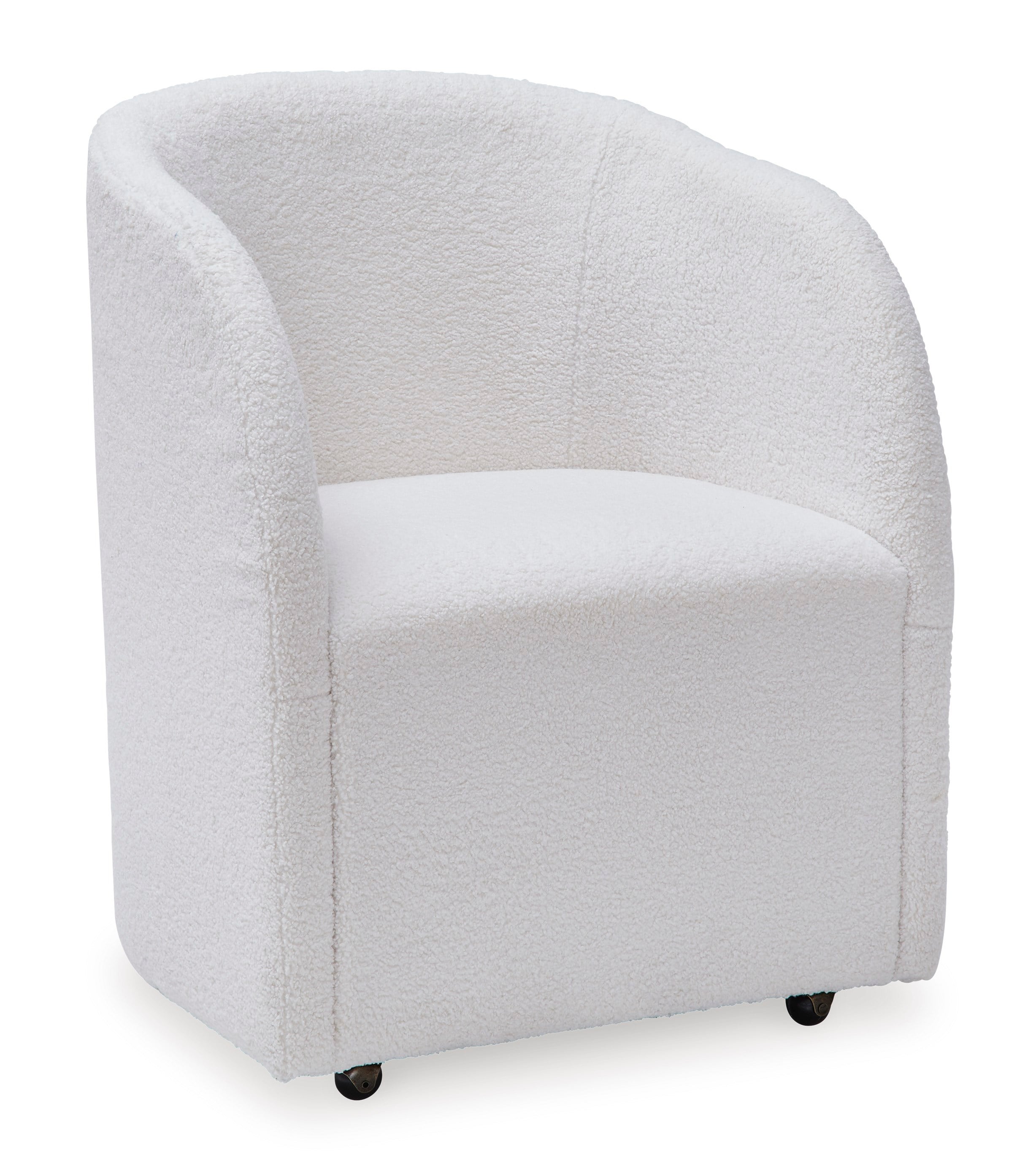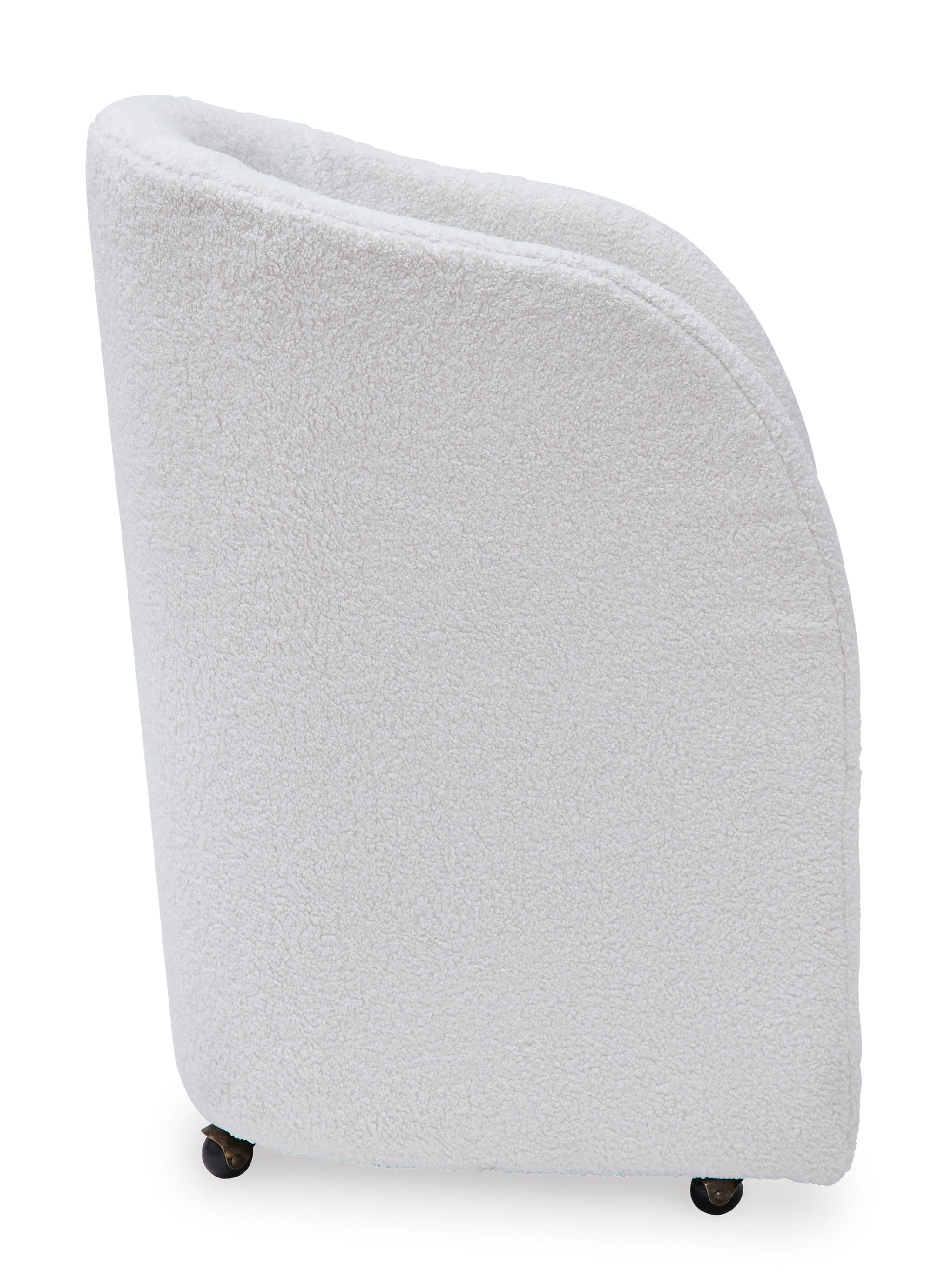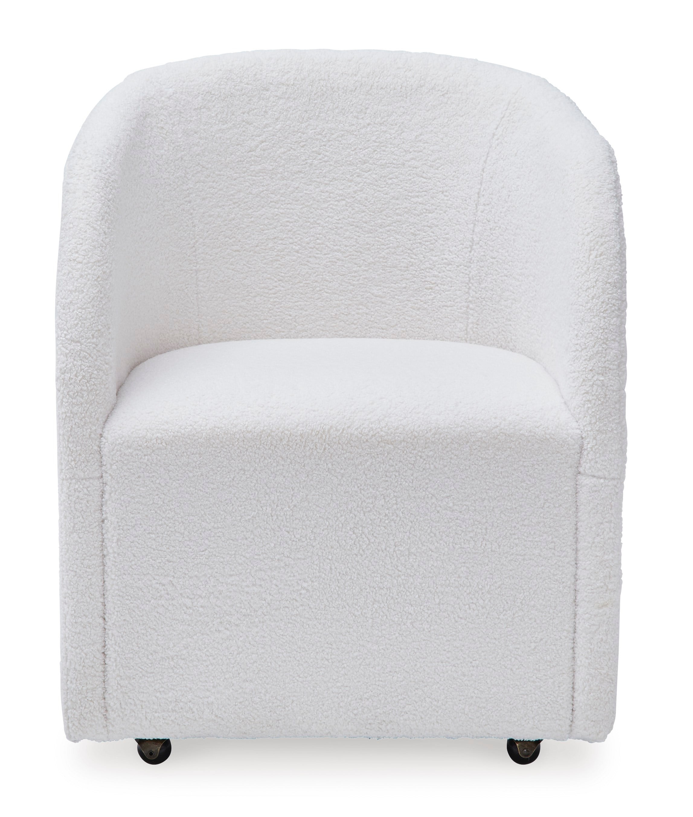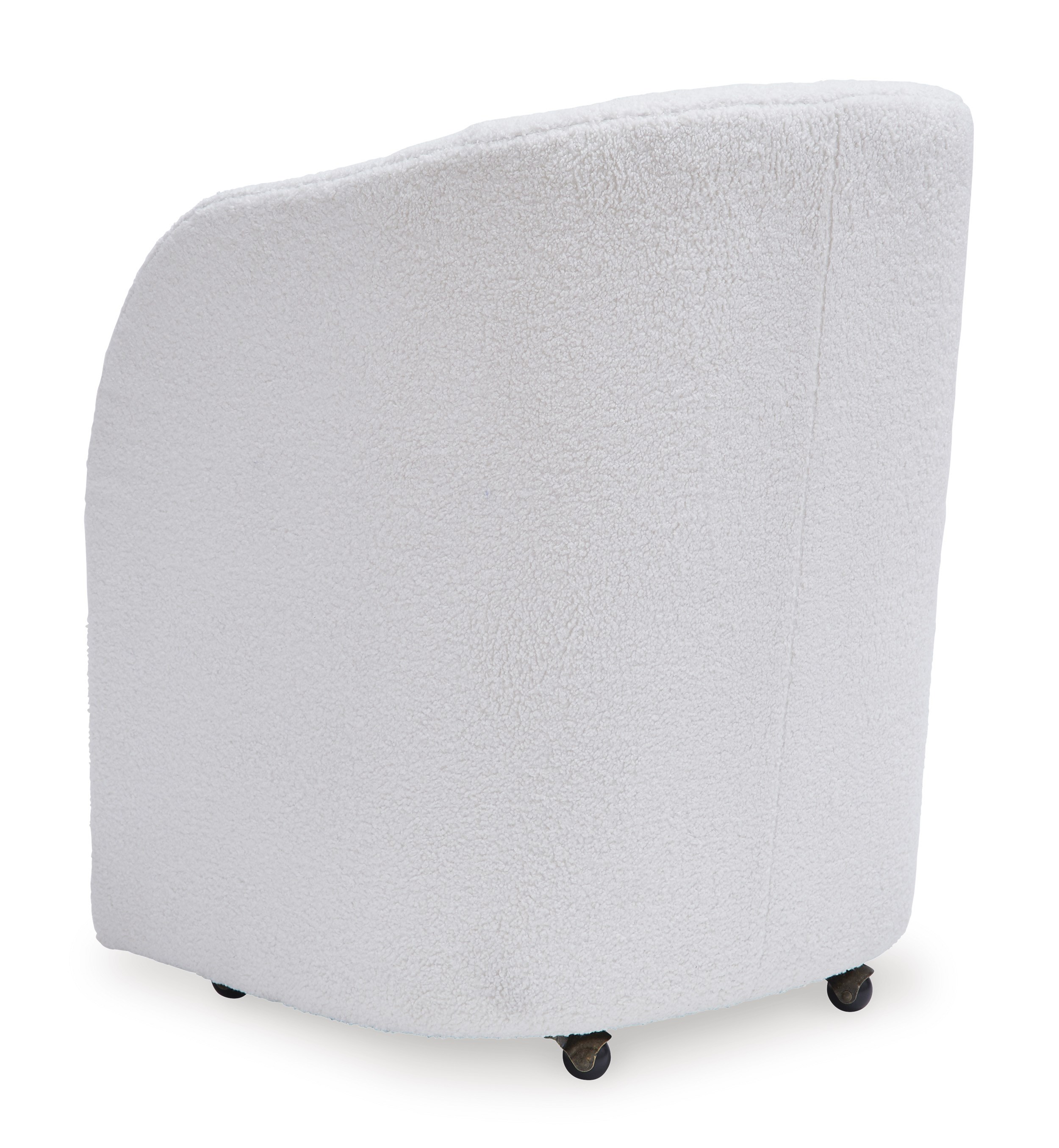 Art deco tasarımın zarif çizgilerinden ilham alan bu tamamen döşemeli sandalye, modern yaşam alanlarına sofistike bir dokunuş katar. Kavisli formu ve yumuşak dokulu boucle kumaşıyla hem estetik hem de konforlu bir kullanım sunar. Tekerlekli yapısı sayesinde kolayca hareket ettirilebilir ve farklı kullanım alanlarına uyum sağlar.